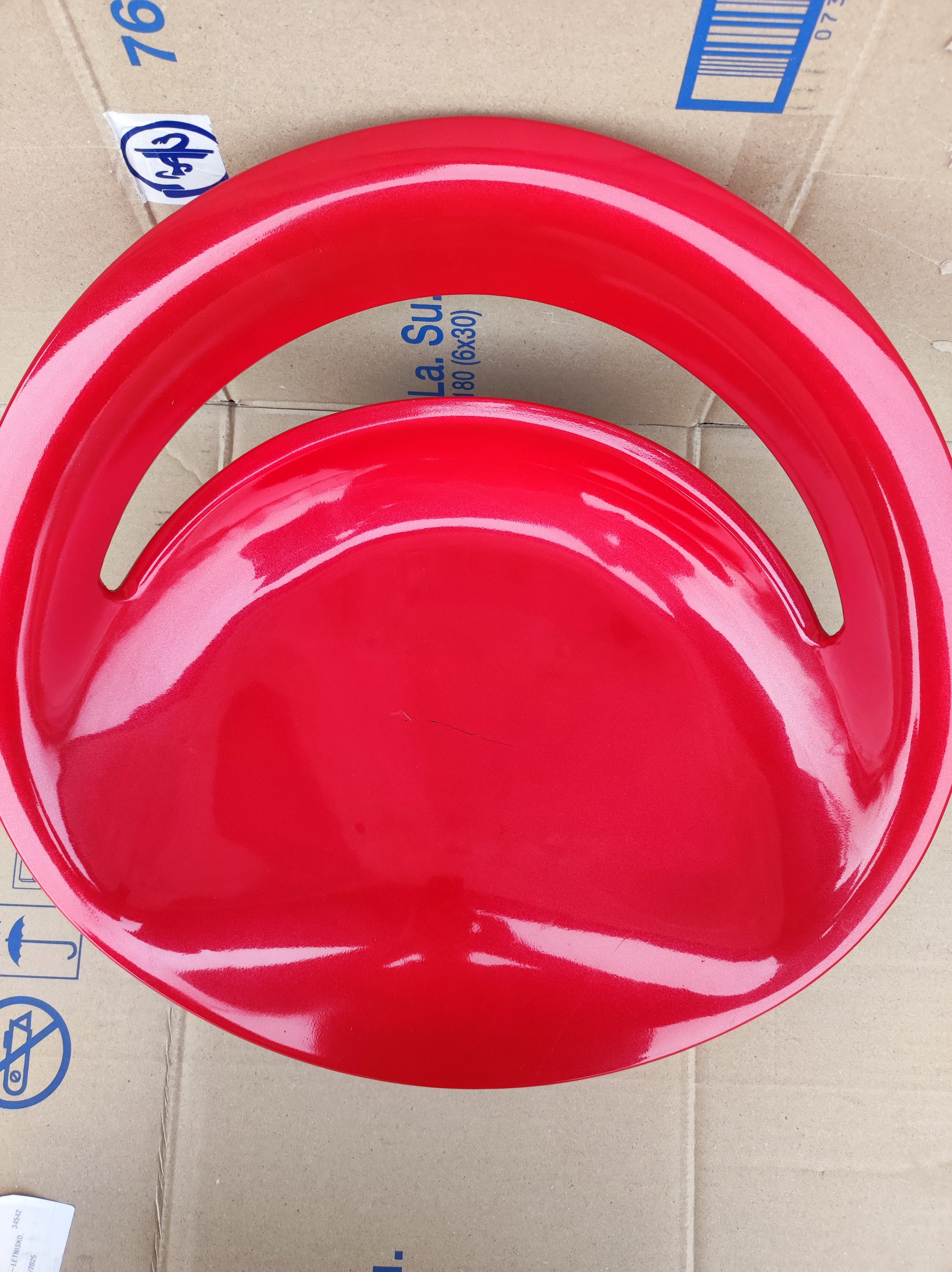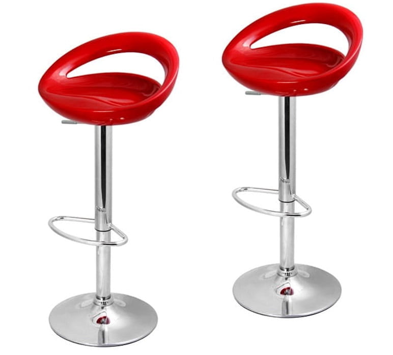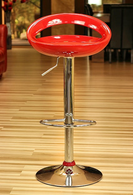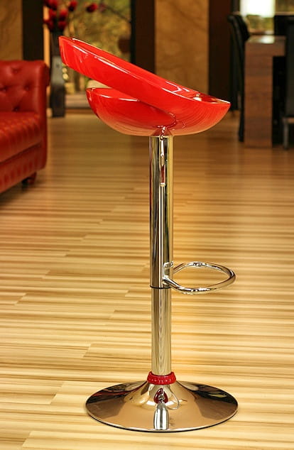 Hoker obrotowy barowy wykonany został z wysokiej jakości połyskującego tworzywa sztucznego. Elegancki podnóżek oraz chromowana podstawa z zabezpieczeniem przed rysowaniem podłóg.
